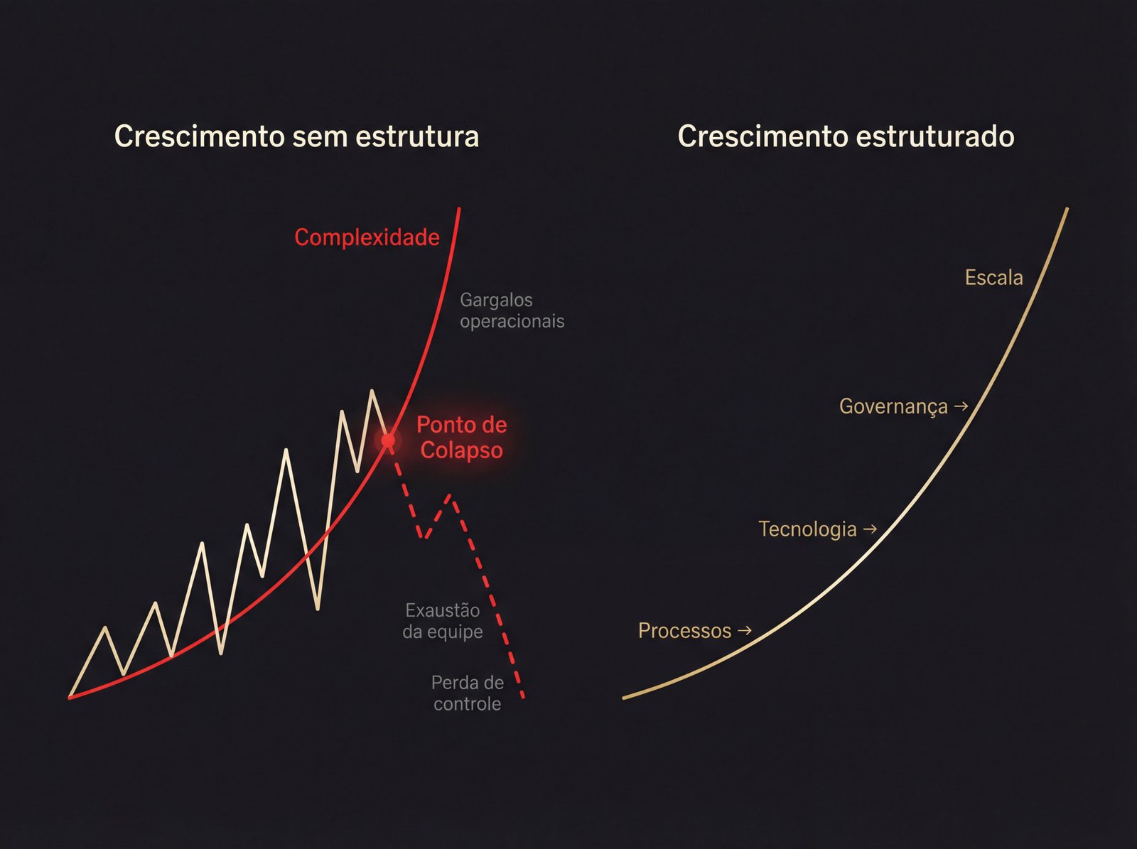 Quando a complexidade cresce mais rápido que a estrutura, surgem gargalos operacionais, exaustão da equipe, perda de controle e dependência crescente do líder. Isso não é fase. É ausência de engenharia.