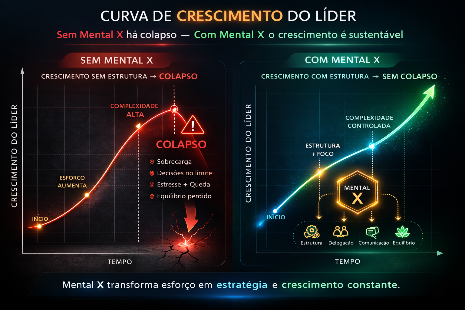 Base do ecossistema Mental X. Quando essa camada não existe, a empresa cresce, mas o líder continua operando em improviso, urgência e excesso de centralização.