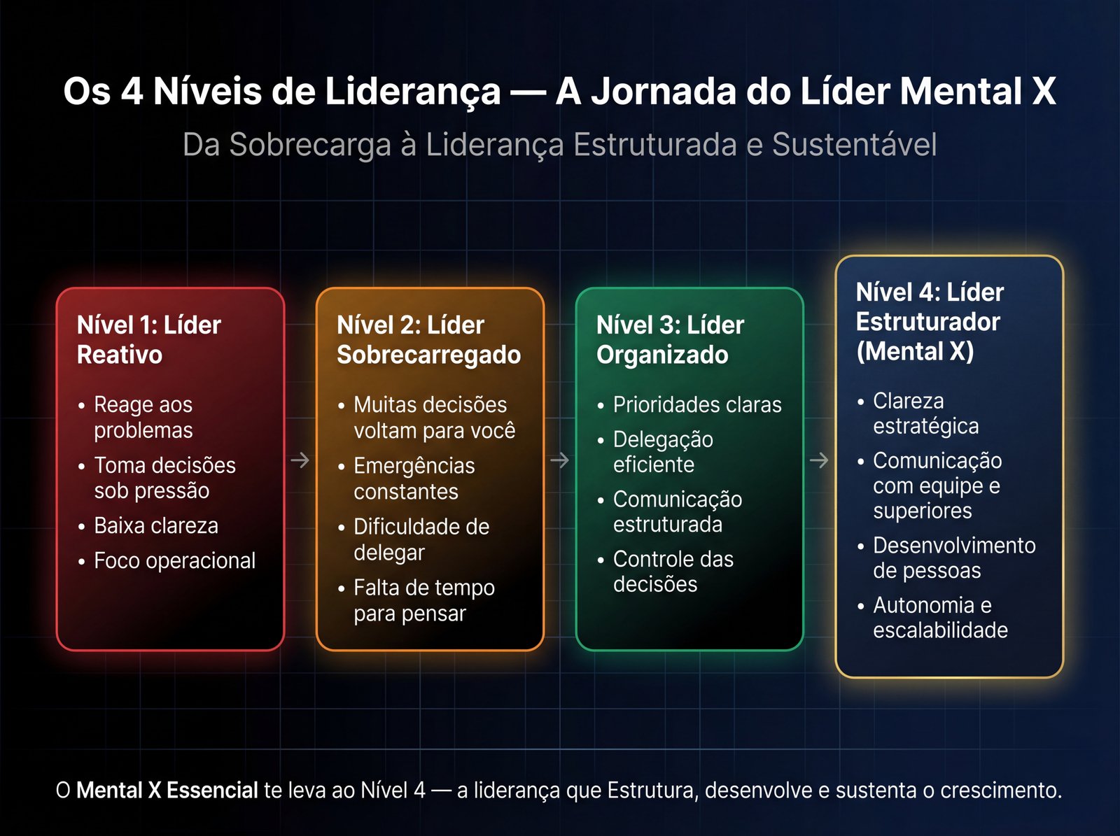 O Mental X Essencial existe para desenvolver exatamente essa estrutura de liderança: clareza mental, decisão, comunicação, delegação e sustentação de crescimento profissional e organizacional.